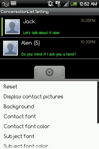 Click "ConversationList Settings" Then Choose "Contact Font",Click "Font Pack" drop down list, And you will see a list,for example: Handcent SMS font pack1,Handcent SMS font pack2,Handcent SMS font pack3,Handcent SMS font pack4,Handcent font pack5...choose one of these packs,if you haven't installed it ,handcent will navigate you to the market and you can install it directly. after you have choosen font pack ,you can choose font at the packs and define the style ,size and so on